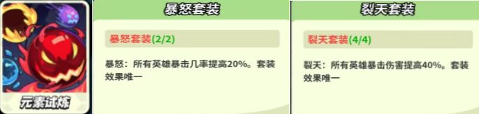 元素试炼也叫团本,这里掉落装备铸魂材料,套装搭配推荐2暴怒+4裂天,高暴击高伤害,裂天套装有大佬实测,其实是加40%最终暴击伤害就相当于1.4的最终暴击伤害。因为是受益bug经玩家和客服的努力下就不修复。