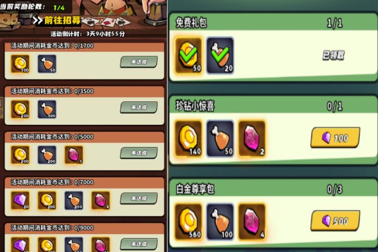 第一周金币活动不建议屯金币,因为要发育推图。金币招募消耗能做几轮算几轮,做不满四轮不勉强。零氪不建议花钻石争夺排名,还是有计划的猥琐发育好。差点金币就买上右图片这两个金币礼包其他不买。