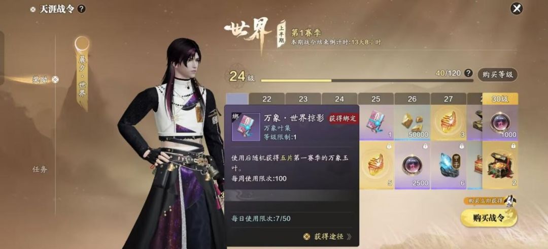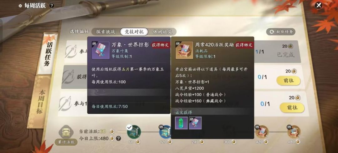 - 摘叶系统:在初始阶段需进入摘叶分页,将从赛季令商店、月漩商店等途径获取的叶集拖拽至树下玉台,可获得万象玉叶。重复玉叶可用于升境,满阶后再得重复玉叶会分解成碎叶,可在碎叶商店兑换叶集等道具。每周有两次许愿机会,可避免获得不需要的玉叶,每周一5点刷新。