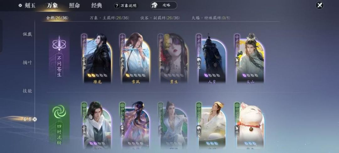 其中“四时流转”的卡牌等级比较低,容易升级,可以作为各位少侠前期过渡时的主羁绊。终极发展方向还是“不问苍生”。