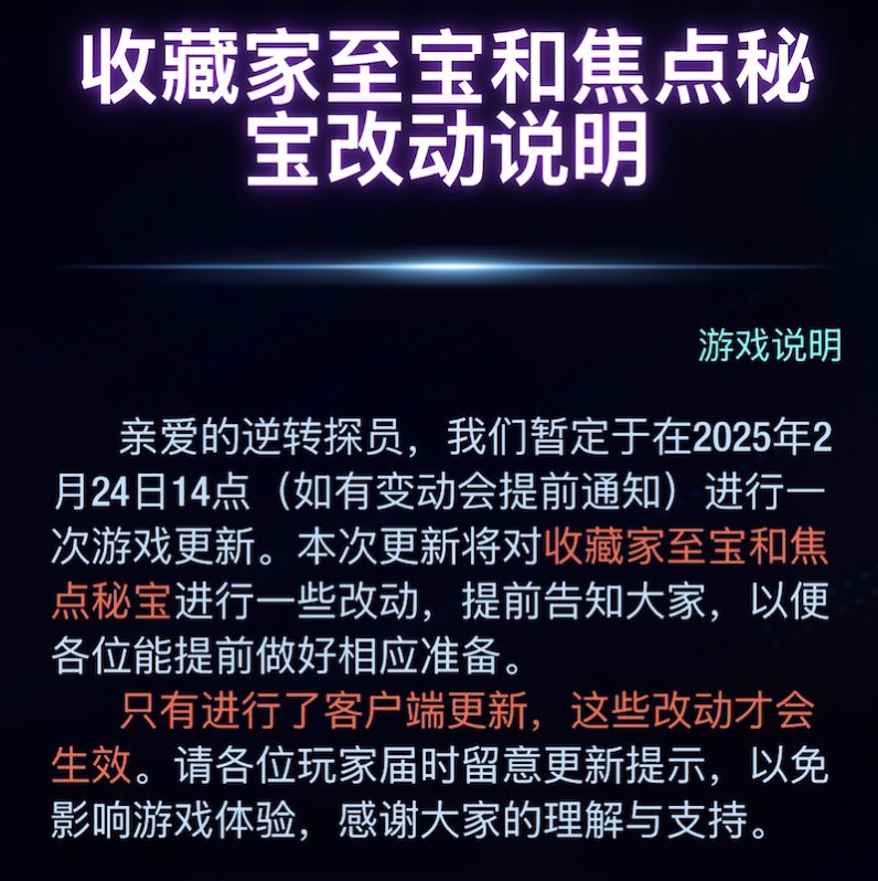 因为游戏将于2025 年 2 月 24日 14点,对游戏的【收藏家至宝】和【焦点秘宝】进行改动,正式与国际服接轨。(所以收藏树的箱子你也可以不用着急开啦