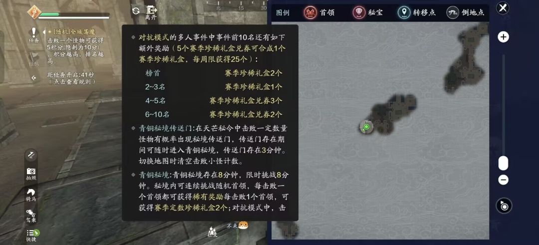 3.移花的部分怪物添加谜之骨头掉落,徐海的部分怪物添加翎羽掉落。本次更新大大的降低了天芒秘境玩法的时间成本,提升了收益效率。接下来我们来看下最高效的探索流程。