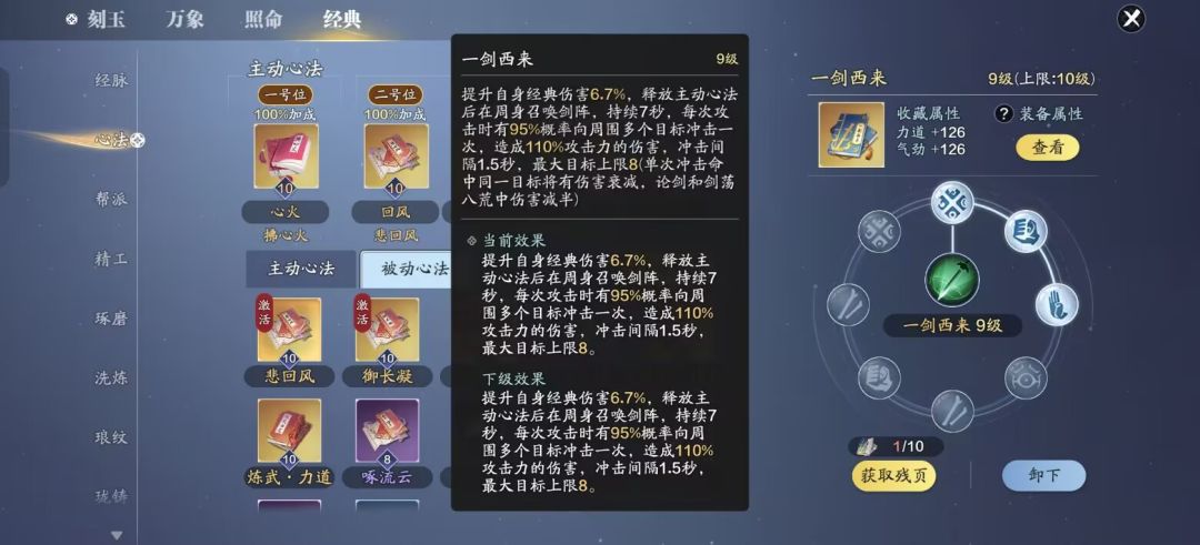 心法推荐(经典服):在经典服的少侠别忘了心法技能,天芒中建议携带【一剑西来】和【天外飞仙】,这两个心法技能可以提升伤害。