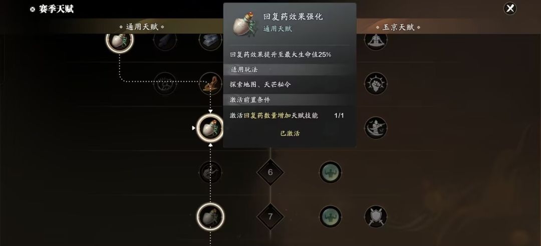 天赋:这个对于大家来说是一个容易忽视的点,天赋在天芒中非常重要,因为现在天芒已经没有天芒商店了,完全需要天赋来补给。建议点出最高等级的回复药效果强化,强化翻滚,强化格挡,强化反制。