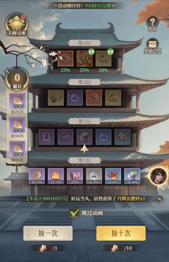 少侠们可使用五雷符在天玑阁中抽奖,从所处楼层随机获得奖励。完成抽奖后,所处楼层有概率上升1层或降至第1层。玩家获得的天师玉玦可在天师宝库中兑换珍稀奖励。累计抽奖达到指定次数,可领取相应累计次数奖励。
