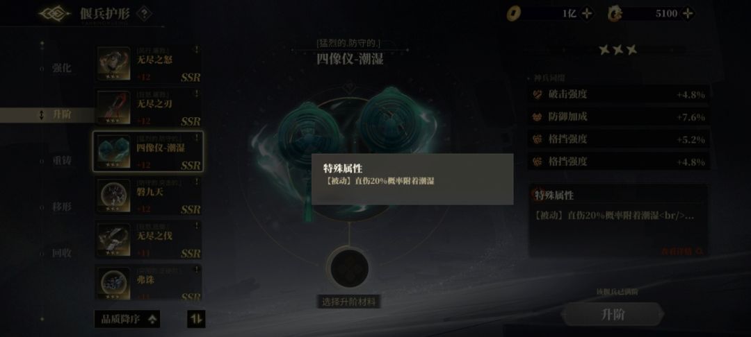 龙子大人们可以通过「偃兵附形」-「神兵阁」-「偃铁阁」活动获得通用偃兵「四象仪-潮湿」。除了提供大量额外属性外,满阶时神兵还附加额外被动效果,有概率造成直接伤害时附加一层「潮湿」,提升叠加潮湿的频率,作为通用偃兵也可以被更多镜灵佩戴。