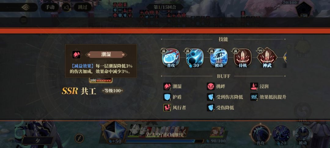 「潮湿」状态单次附加一层时持续两回合,每层都会降低一定比例的伤害加成和效果命中,可被免疫、可被驱散,属于减益中的软控效果。