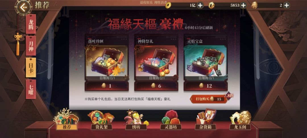 神降祭礼-大荒通宝*6:镜心1,精力*60,扫荡票*20,梦境自选礼盒1,偃铁残片*1(每日限购1次)