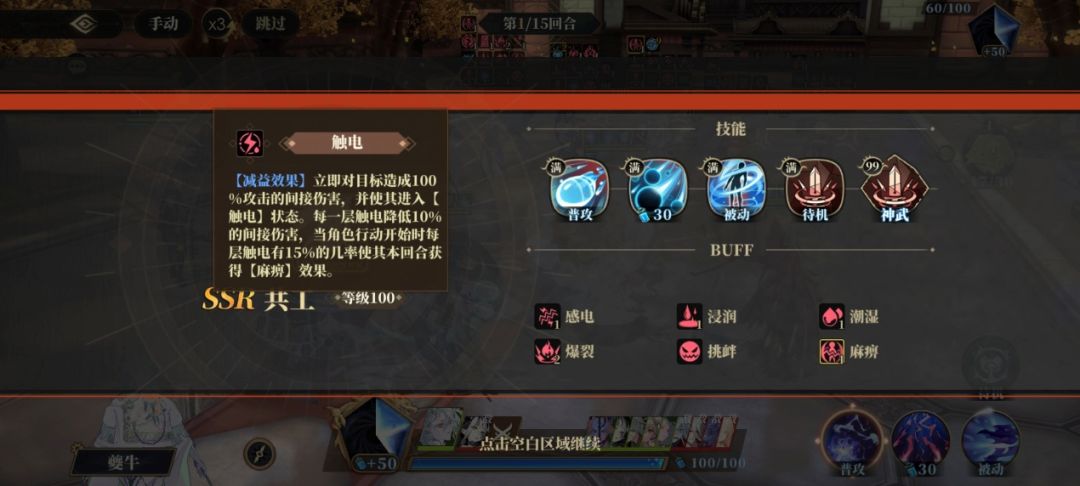 夔牛「雷鸣连击」的先机技能可以在入场时稳定为敌方全体叠加2-3层「感电」效果,配合入场时的「潮湿」可以抢先合成「触电」效果,由触电效果造成的「麻痹」状态作用上类似冰冻、眩晕但无法被净化是一种十分强大的控制buff。在对局时,我们经常会发现由夔牛技能触发的「感电」拥有两个独立的图标,虽然名字相同但两者带来的效果有着根本差异。一类是我们常说的参与灵气连携的「感电」,另一类是由夔牛被动引发的造成伤害时「感电」效果,效果为速度降低,这类「感电」并不参与连携体系。
