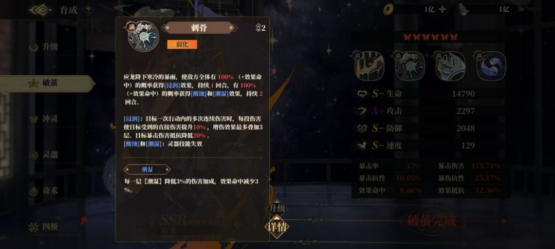 应龙是为数不多的可以主动施加「潮湿」状态的镜灵,其弱化技能「刺骨」可以附加一层持续两回合的「潮湿」,同时还伴有连击易伤、灵器封印、灵气控制等其他负面效果。