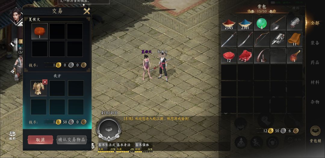 2. 放置物品:双方大侠可将各自想要交易的珍贵物品,如武学残页、精良的神兵利器等,放入交易窗口的物品栏位中。最多可放置 6 个物品道具,放置过程中,请务必仔细确认放入的物品是否正确,避免因一时疏忽而造成误操作。