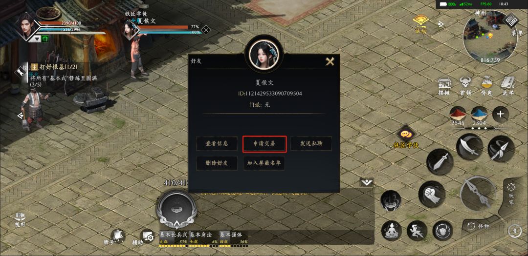 2. 点击申请交易:当 A 玩家锁定 B 玩家后,点击 B 玩家角色,此时屏幕上会弹出 B 玩家专属的头像框信息窗口(如下方截图所示)。在这个窗口中,“申请交易” 按钮醒目地位于其中,点击此按钮,即可向 B 玩家发起交易邀请。