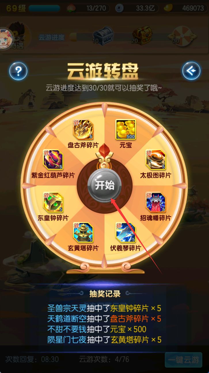 在云游界面的三十次抽奖轮盘中,没有奖励的情况下,连续点击开始八次