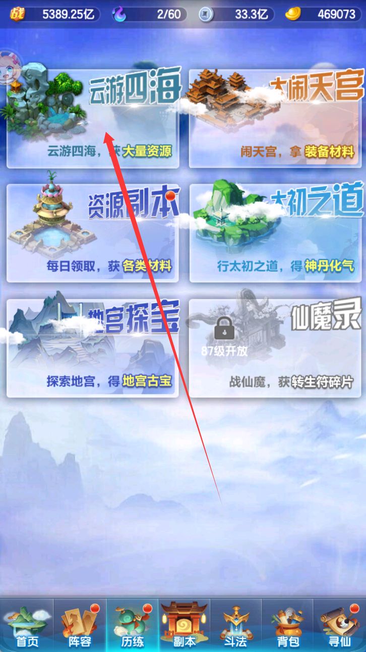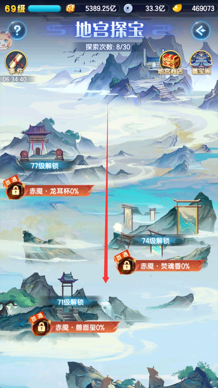 在历练的地宫探宝中,一直往下划,屏幕下拉抖动六次