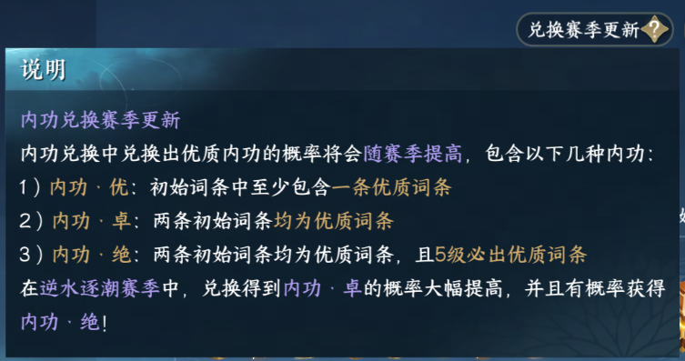 4)内功兑换品质大幅提升:新赛季内功兑换中获取优质内功的概率大幅提高、并且有概率兑换获得【内功·绝】,助力各位同门快速养成内功