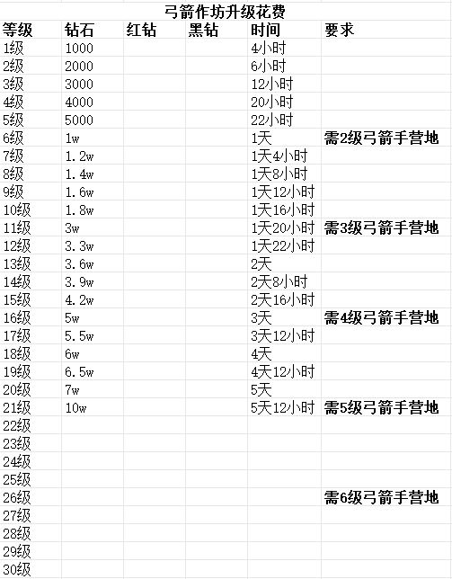 弓箭作坊升级花费。