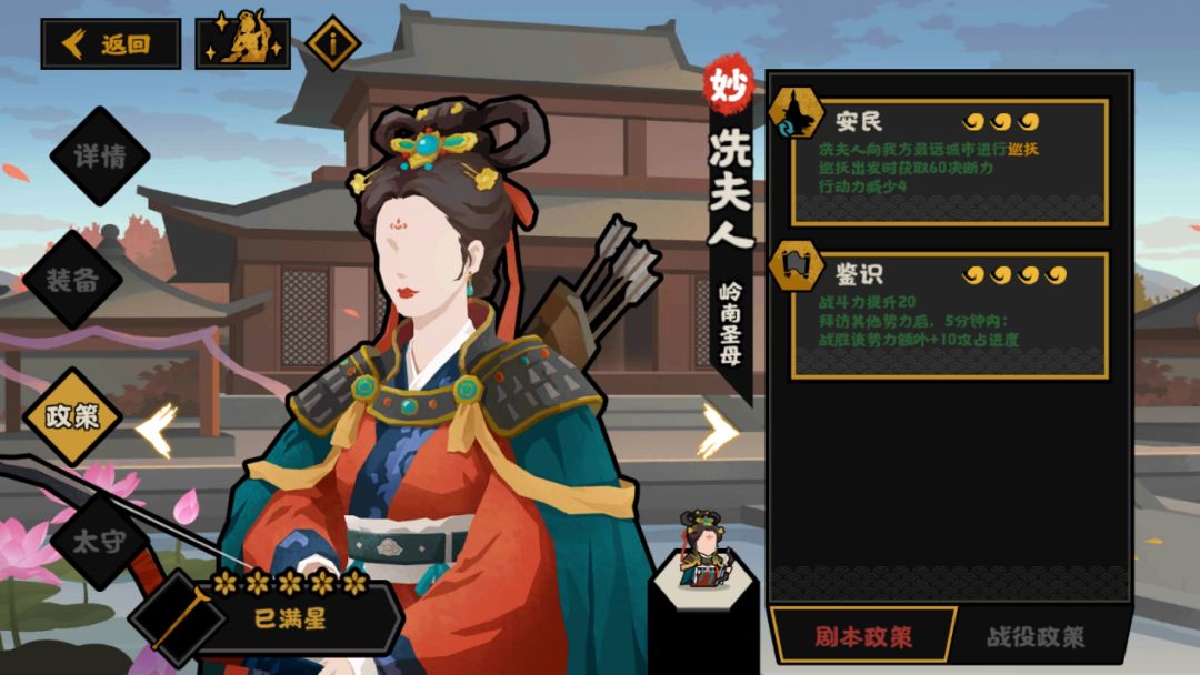 由于冼夫人是民生位名臣,目前民生位提供攻占进度的名臣并不多(只有鲁班的器械),在部分没办法累战、存在要地的剧本里,攻占进度还是有不错的发挥的。