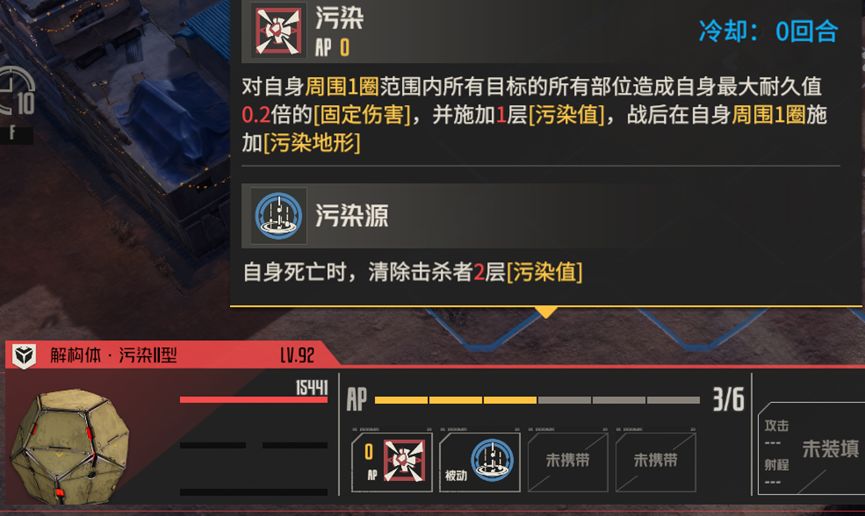 三是所有敌人的范围攻击均会造成污染地形,污染地形会对停留上面的单位叠加2层污染值,并且没有持续时间限制,无法被地火和战略领域覆盖,只能在触发后消失或者被解构体清除;