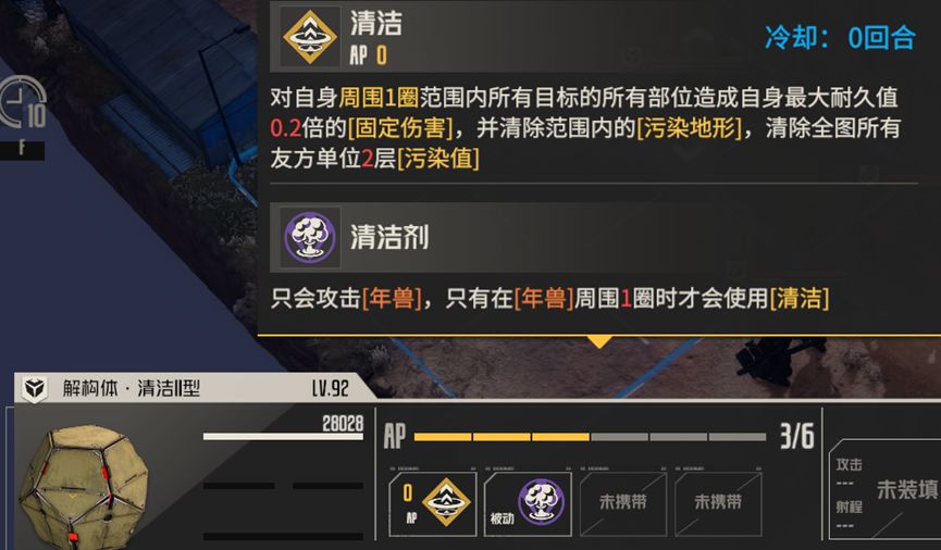 我们并不能像挑战一中一样,通过消灭自律机兵来清除污染值,只能借助场上刷新出来的两种解构体来清除污染值,两种解构体效果各不相同,清洁解构体为友军,会在位于年兽周围1圈时自爆,清除污染地形并清除我方所有单位2层污染值;污染解构体为敌军,会自爆攻击我方,将其消灭可以清除击杀者2层污染值