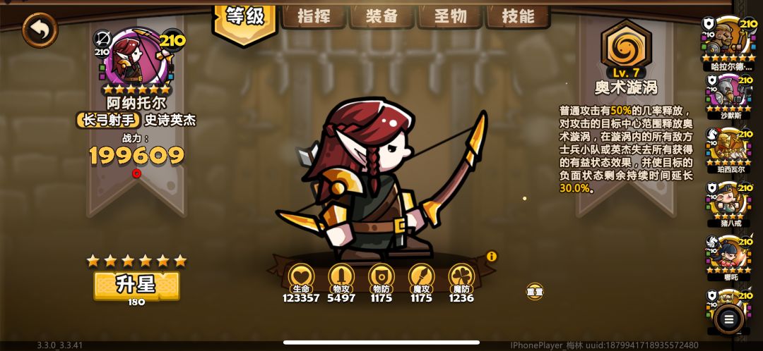 角色定位:物理爆发型.破甲射手.兼具群体减防.圣物优秀.二段圣物部队射程距离就增加了20.大概一个方阵的距离就是20.四段弓箭属于射手大核心TOP级别的必上射手.手长.50%高概率触发范围技能.可以快速清理敌方士兵集群.造成血量压制.而且技能的减防效果可配合其他物理输出英杰.形成爆发输出!主C射手!高星必上!