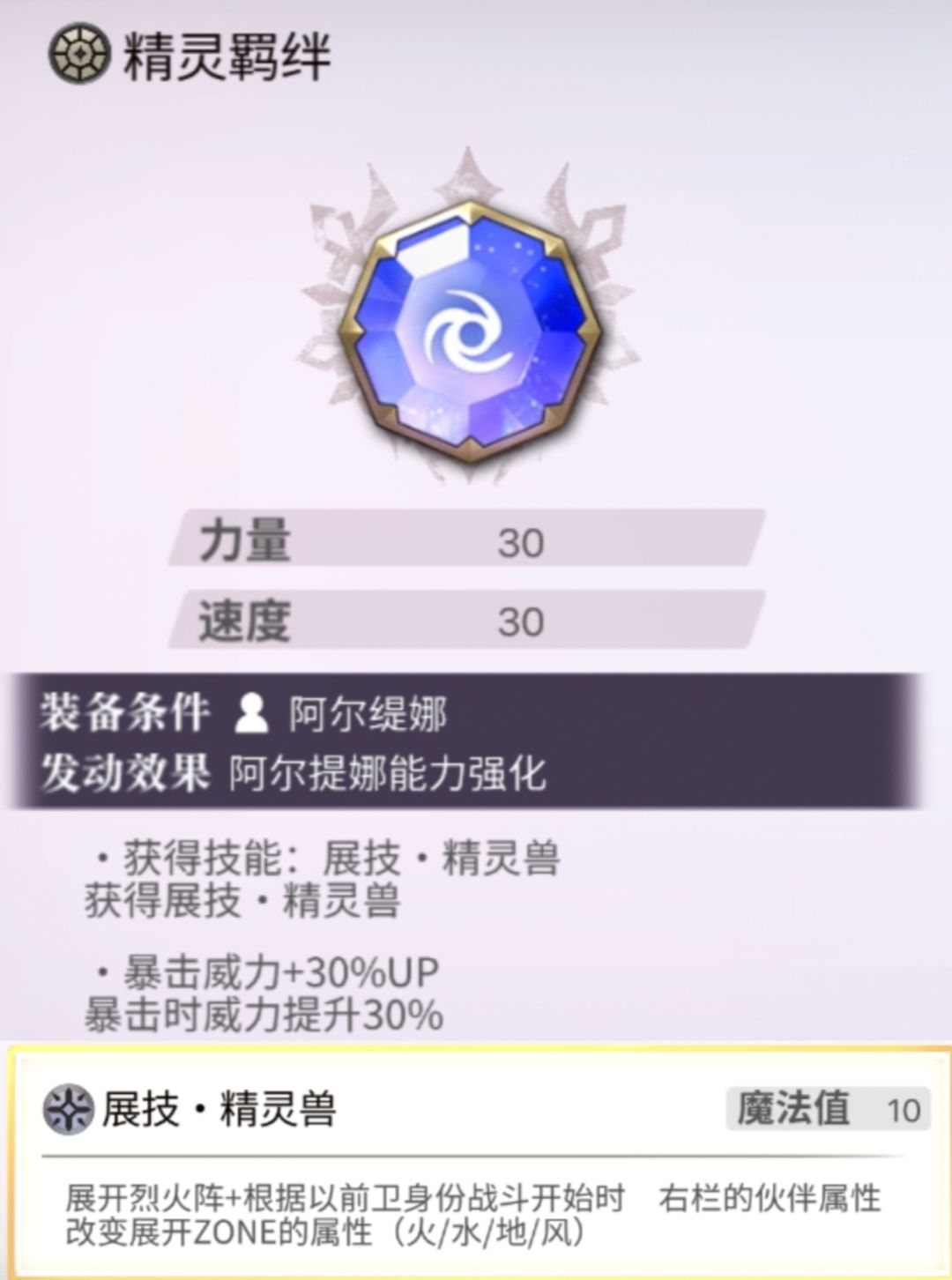 并且其专属灵晶“精灵羁绊”可以为其提供一个展阵技能,但和其被动不一样,只会展火水地风阵,且默认为火阵。
