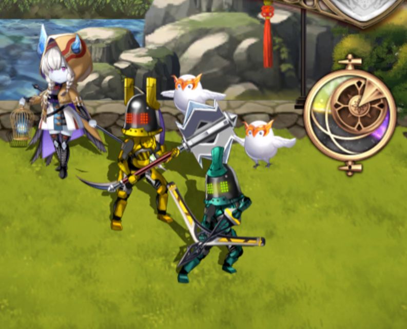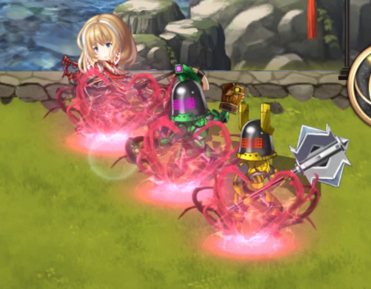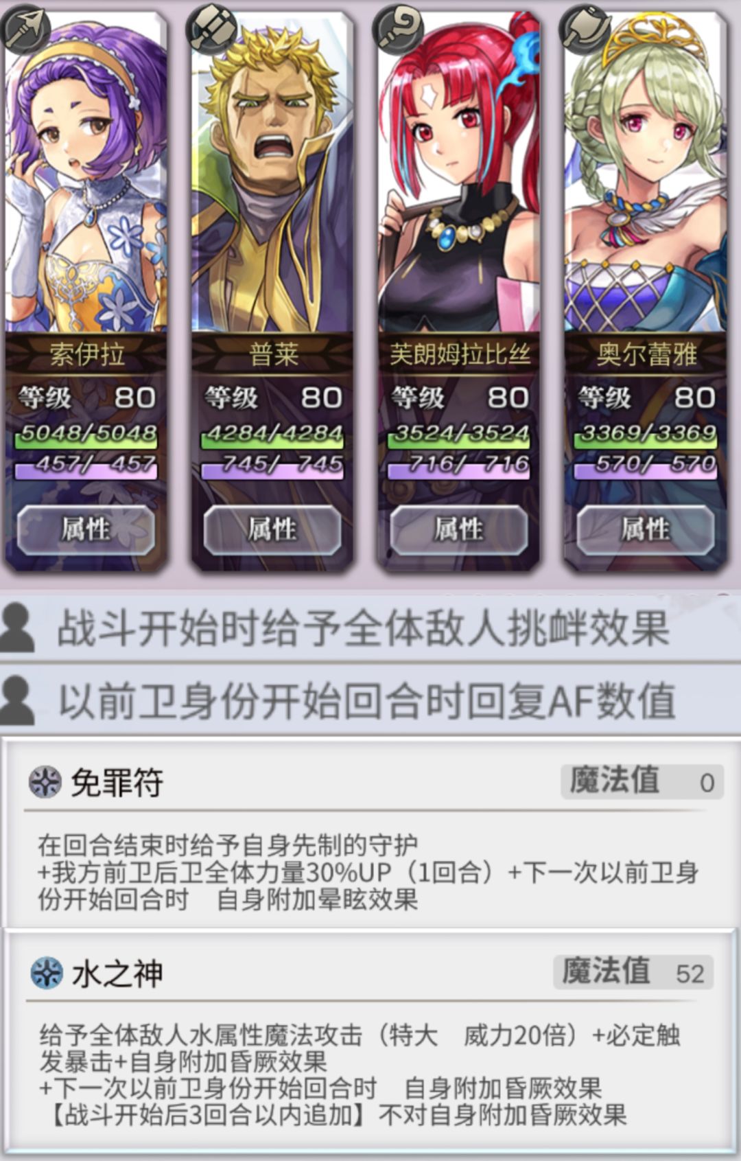场景假设:在经过漫长的战斗后,我方将与对方进行第N个回合的战斗。回合中,普莱使用免费符免费符守护队友,芙朗姆使用水之神攻击,奥尔蕾雅使用抵御进入祈祷状态。根据技能描述,普莱和芙朗姆将会在第N+1回合陷入晕厥状态(无视耐性),然而事实确实如此。N+1回合开始前的行动如下:首先是最左侧的索伊拉回复10%的AF数值,其次普莱晕厥,然后芙朗姆晕厥,最后奥尔蕾雅回复普莱和芙朗姆的晕厥状态,使他们能够在N+1回合继续使用免费符和水之神。