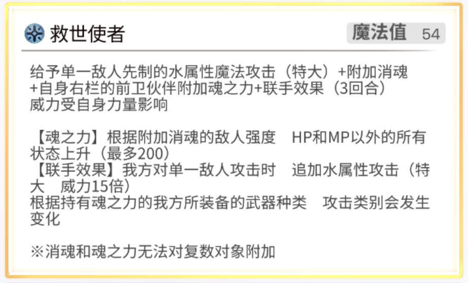 联手:我方对敌方单一攻击时,追加一次高倍率水属性攻击,攻击类型根据联手的队友的武器类型而不是技能类型改变。比如联手洁尔法妮,就攻击类型就是〈斩〉而非魔;联手阿尔玛,攻击类型就是〈突〉而非〈魔〉。