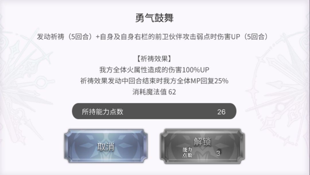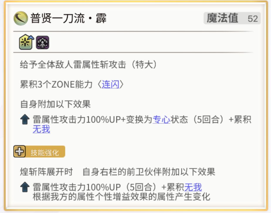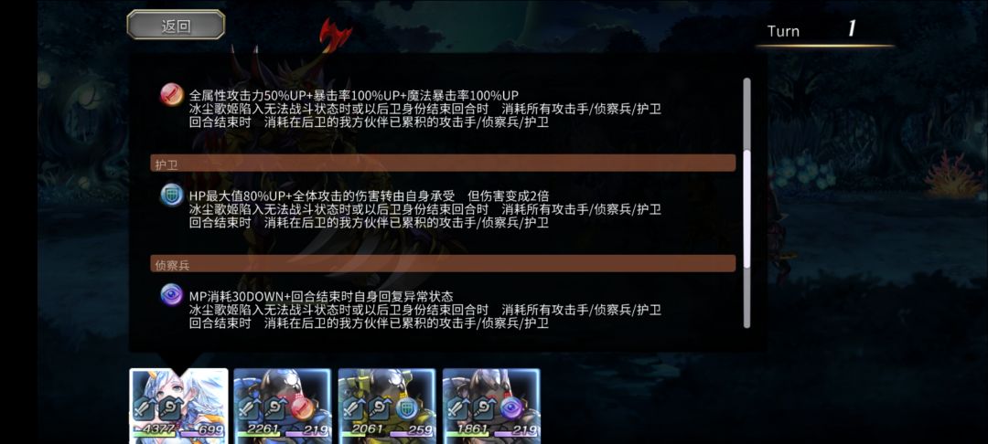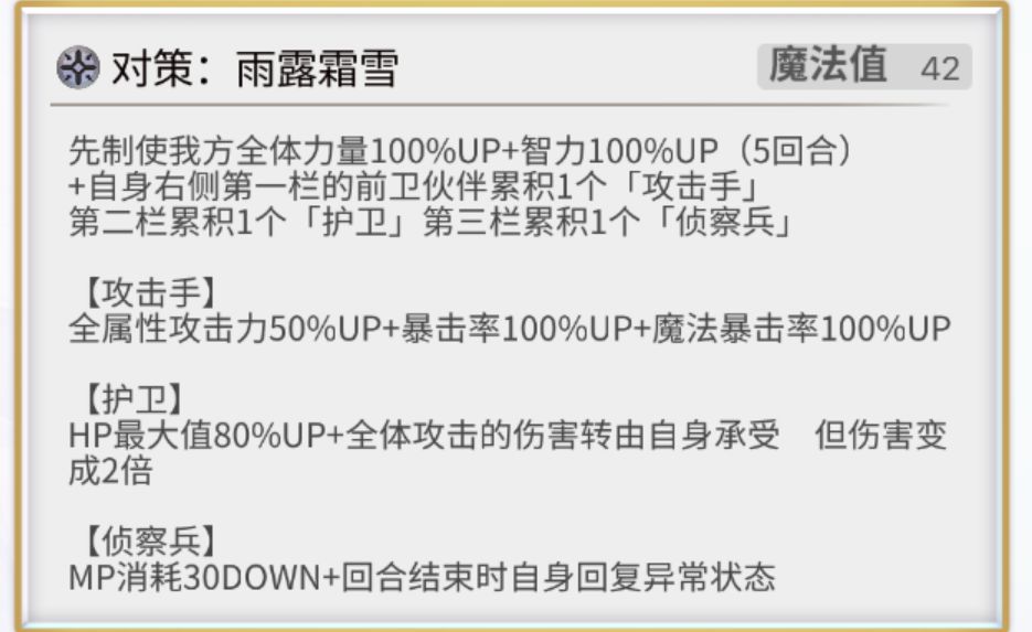先制附加力智100%UP。该技能还会为冰尘雪乃从右往左三个伙伴依次附加【攻击手】【护卫】【侦查兵】三种珠子。具体每种珠子什么效果都在技能文本上了,不再过多叙述。
