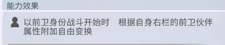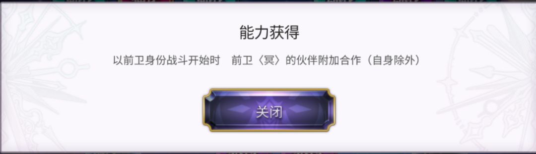 星导被动Lv1,战斗开始时,为前卫所有〈冥〉的队友附加合作,这其中不包括自身和〈天〉的队友。