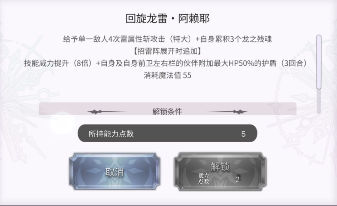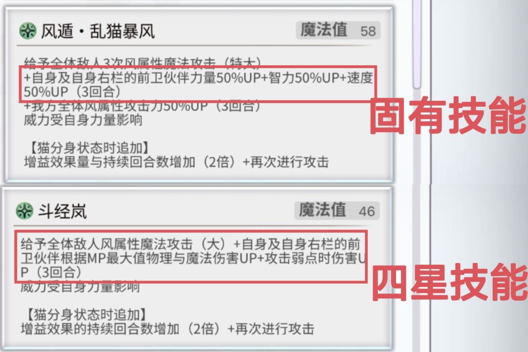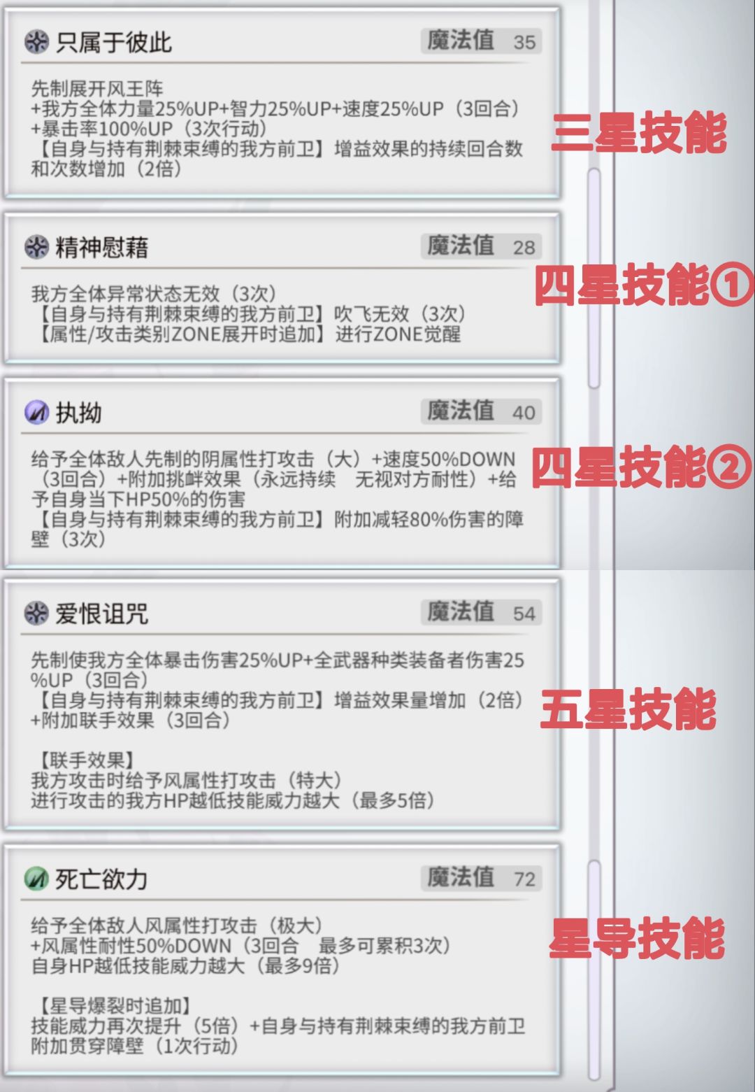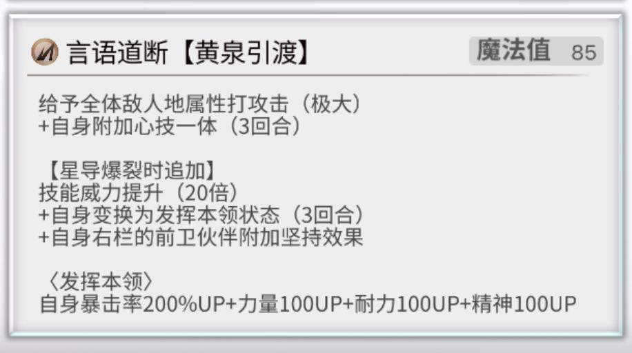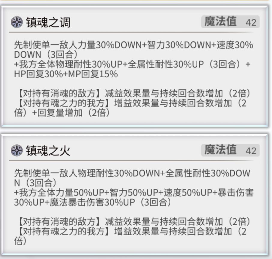 魂之力:与消魂联动,根据持有消魂的敌人等级持有魂之力的我方提高力速智耐精幸,最多200。