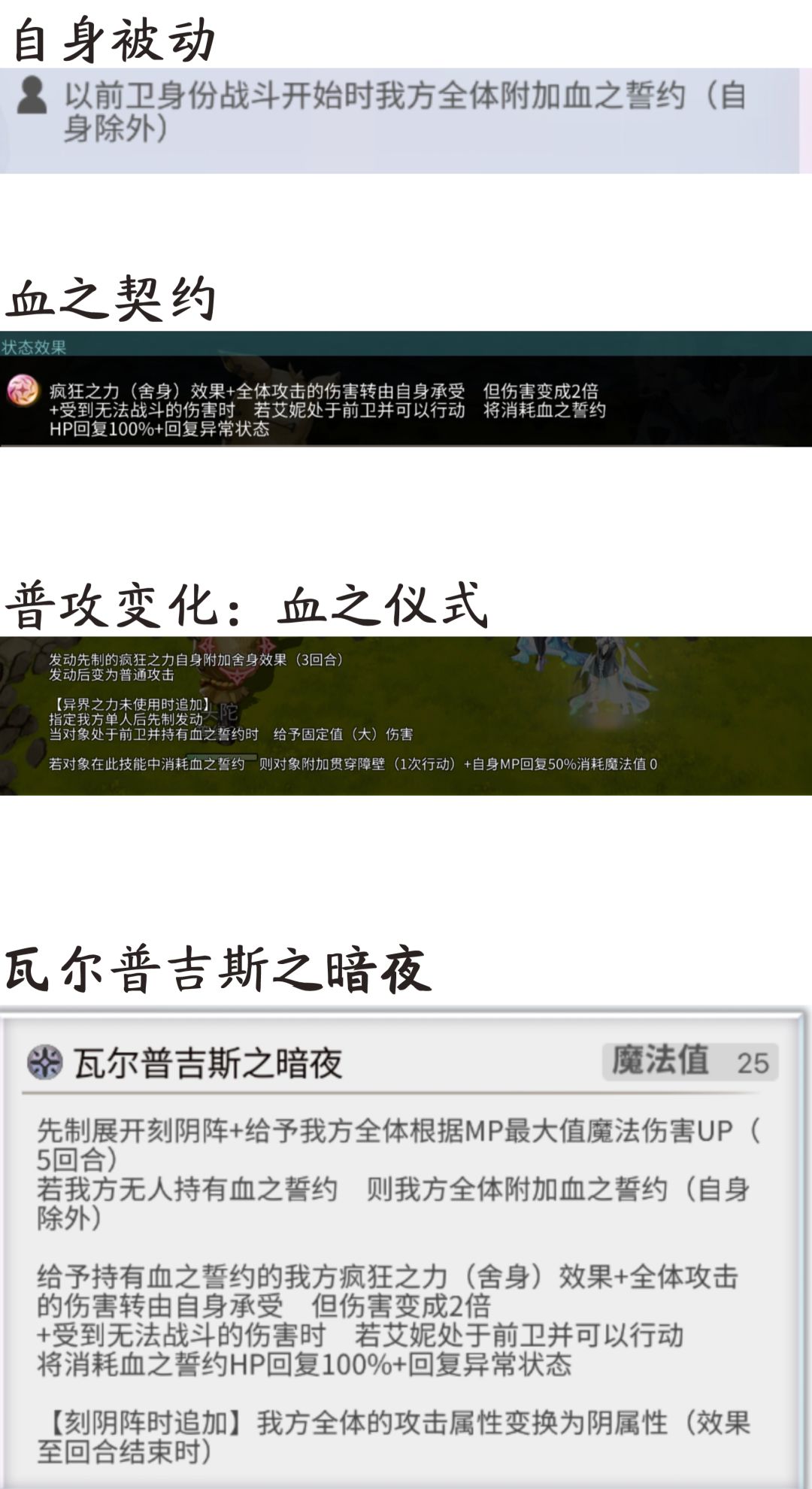 血之契约:为前卫角色附加血之契约效果,持有血之契约的我方附加疯狂之力-舍身和庇护效果,受到致命伤害时消耗血之契约并复活该角色。