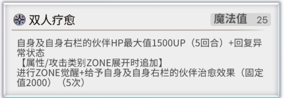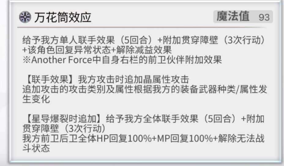常态下,可以指定一名队友获得联手效果+贯穿障壁+回复异常+解除减益。就像伊法AS/克罗德ES/花灿月华/诺娜AS/艾妮一样,可以指定某个队友。有很高的灵活性。