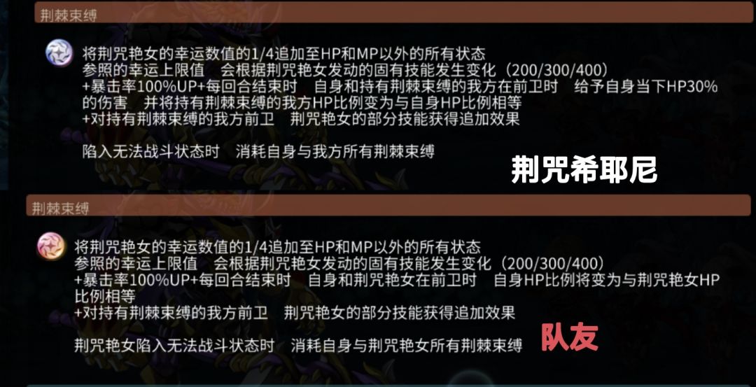 荆棘束缚能将希耶尼的幸运值的1/4数值同等地加到自身和队友的六维上,但附加的1/4幸运并不会拿出1/16继续参与后续的数值附加。