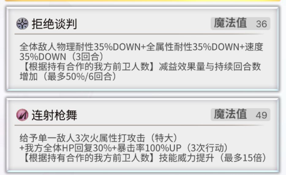 合作:使用固有技能时莲莉会为右侧的一名队友附加合作。如果想要拥有更多的合作,就得将已经获得合作的队友移至后卫,并为下一个队友附加合作。上述操作重复多次,当最后一个队友获得合作时,方可把之前获得合作的队友移动至前卫。操作繁琐,想要让全部队友获得合作并且全部移动至前卫,最快也得第3回合。