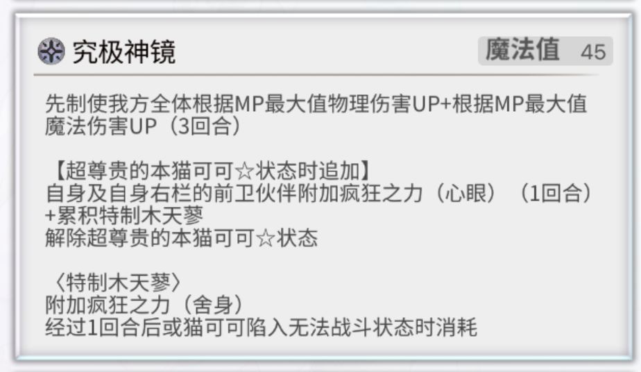 猫可可消耗特殊状态,使用最强固有技能,可以为自身和右侧队友同时附加疯狂之力-心眼和疯狂之力-舍身。