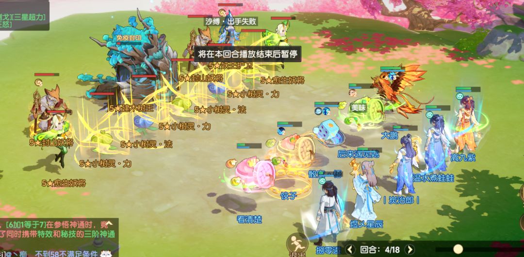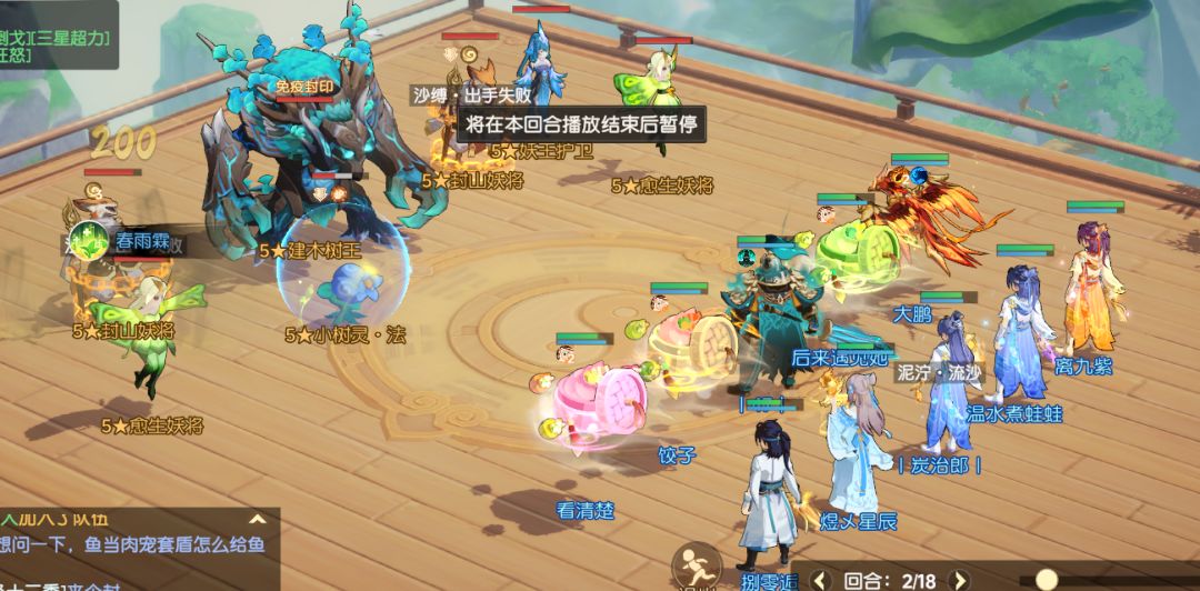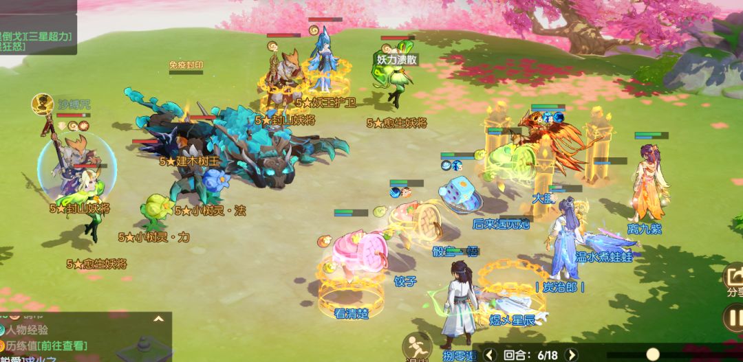 第四回合:由于我的宝宝掉点,导致第四回合我们没有将树王击杀,三刀的追风都没有出也没有暴击。但是没关系。我们状态还在。第四回合我们让一个三刀去带走树人,这时候如果不带走很有可能会吸血。还有一种选择是清小怪,第五回合带走。我们选择了前者。