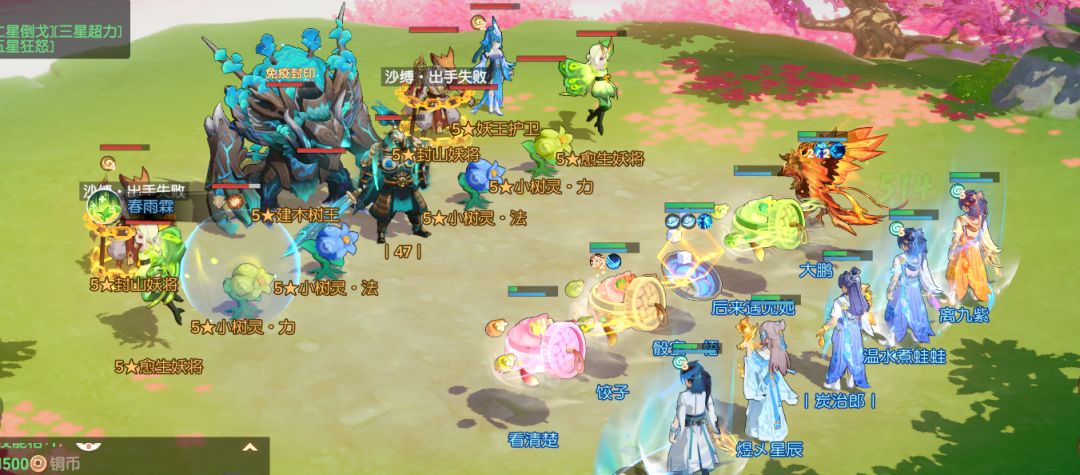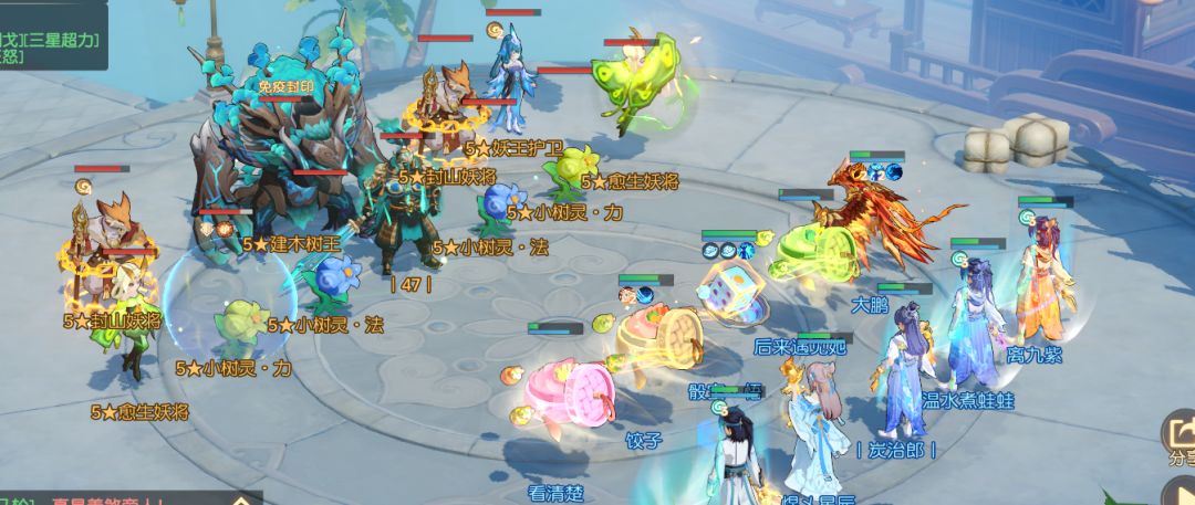 第五回合:小怪还有两只,我们奶妈和一个三刀倒地。不要害怕,没有关系,奶妈处于被封的状态,我们不需要拉奶妈,保护输出。这时候我们上面说过建树妖王的输出点只有2.5个,限制住输出,守好尸体是关键。