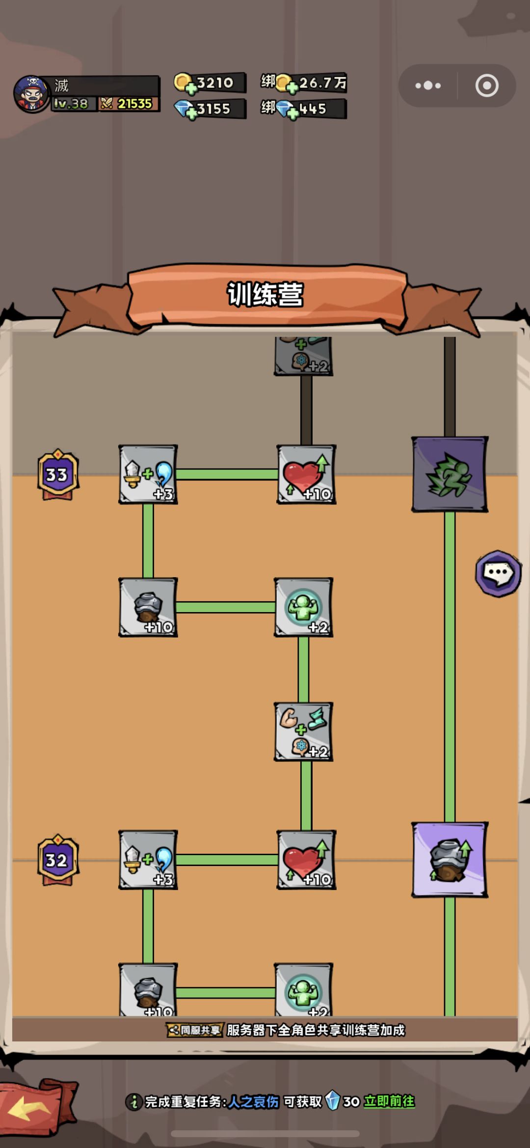 副号每天要做些什么:1.日常任务拿到100篝火点 2.副本清剿(个人副本每天都可以免费清剿一次,出的装备分解的石头给主号升“大使馆”)所以副号等级越高,能打的副本越多 3:挂野外稀有boss(怪物藏品主要靠副号,还能顺便打装备分解继续提升主号大使馆)4:刷重复任务(提升训练营,为什么不用主号,因为主号要挂机升级没空,建议副号最强的法师去刷)