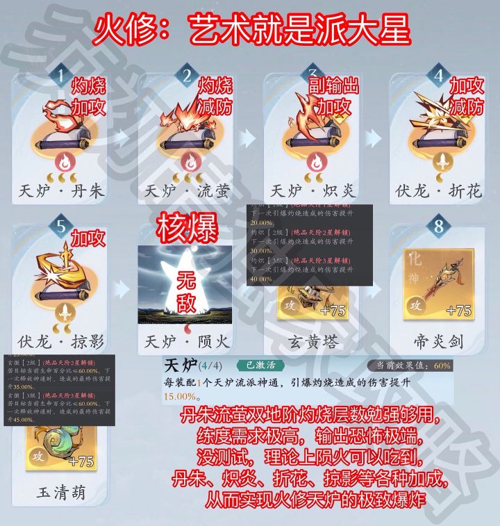 之前研究了一下,还没成型,灵界就来了,艺术就是派大星,非常极端,练度需求极高,自己练度太低没法测试,灼烧也勉勉强强,需要大佬测试,理论上强无敌