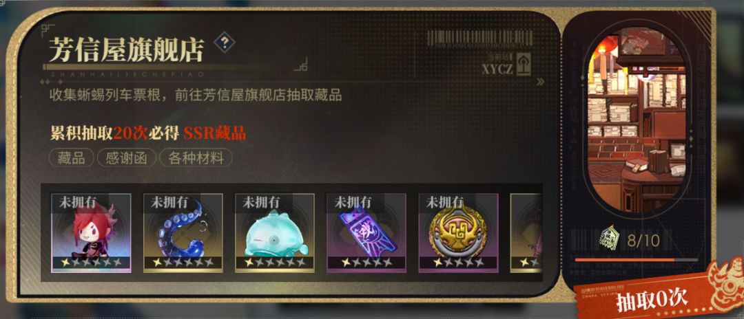1. 芳信屋旗舰店:收集蜥蜴列车「票根-单程票」,前往芳信屋旗舰店抽取藏品,每积攒10张「票根-单程票」,可参与1次芳信屋旗舰店的礼品抽奖,累积抽取20次必得SSR藏品