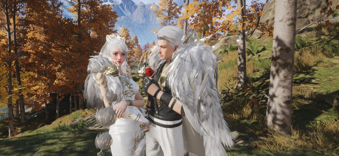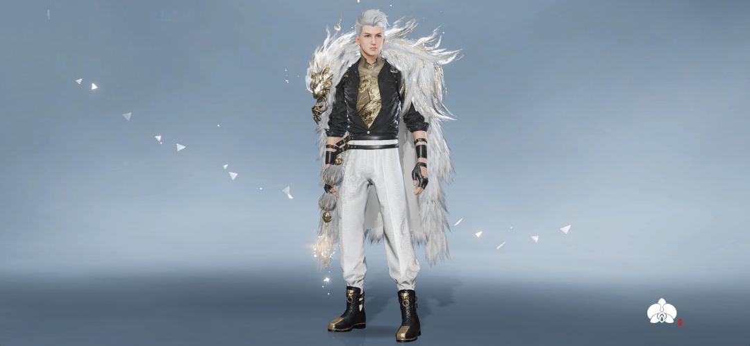 「圣辉·皓雪凌」时装包含头饰、整装、手部、鞋子四个部分。女款整套造型以洁白为基调,辅以细腻金色纹理。贴身长裙设计精致,大腿右侧巧妙开叉,边缘装饰以细腻毛发滚边,增添灵动气息。胸口与领口处精心绣有金色纹样,勾勒出高贵典雅的轮廓。