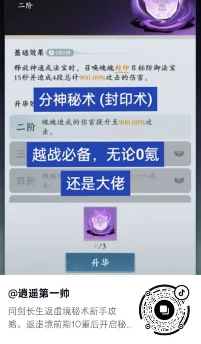 逍遥仙长主要带来的是各类型秘术通俗版的讲解,帮助大家更直观的理解秘术分神秘术:越战必备,无论是0氪还是大佬玩家都推荐托天秘术:类似于名刀,可以四秒内无敌,关键战局反杀必备恶身秘术:类似于分身术,但是不作为三个秘术的优选混元秘术:被破盾时有30%概率恢复一层护盾,可以帮助你扭转乾坤噬魂秘术:佩戴后相当于直接启动后备隐藏能源,推荐0氪玩家佩戴,在队伍里可起到辅助的效果业火秘术:仙长认为该秘术伤害较低且冷却期长,不推荐团战的时候使用此外,仙长还在视频内给出了不同氪度玩家推荐佩戴的秘术~可以前往视频观看哦
