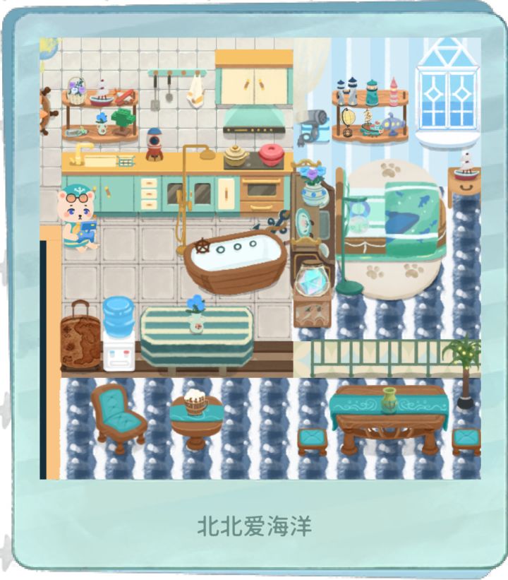 北北的蓝白船舱式卧室挂满泛黄海图与贝壳风铃,飘窗上摆着北极星罗盘与望远镜,霜纹地毯似凝结着极光碎片;