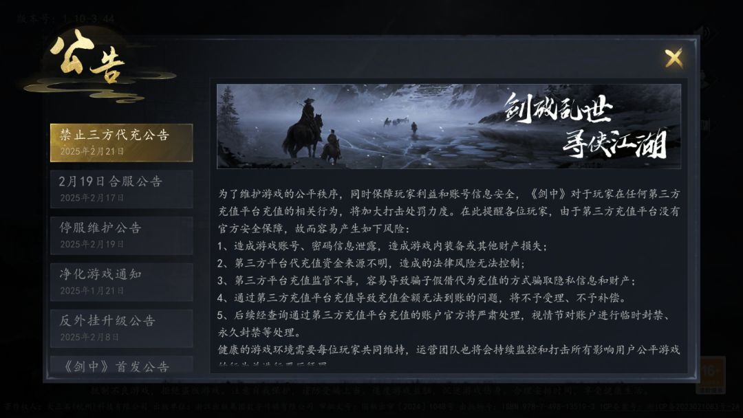 为了维护游戏的公平秩序,同时保障玩家利益和账号信息安全,《剑中》对于玩家在任何第三方充值平台充值的相关行为,将加大打击处罚力度,处罚措施包括但不限于如下一项或几项: