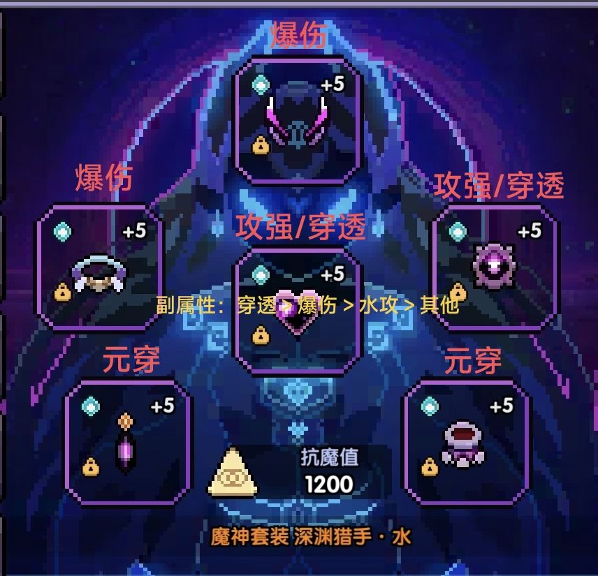 副属性:9元穿,7水攻2爆伤/6水攻3爆伤,水攻可以适当洗多一点,不过还是哪个更接近最高值用哪个