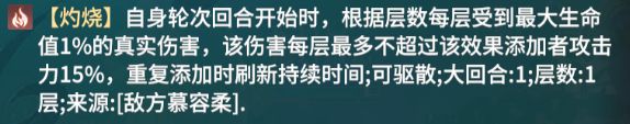 火系特征:回合开始时,根据层数,每层造成自身最大生命值1%的真实伤害,最多不超过状态来源的攻击力的15%,最多可叠加10层,持续2个大回合,重复添加状态时刷新持续时间;可被驱散