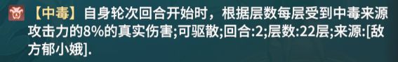 毒系特征:回合开始时,根据层数,每层造成伤害来源攻击力的8%的真实伤害,持续2回合,可被驱散