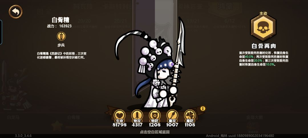 复活战白骨精t2,相比之下另一个复活战克撒只能复活一次送两队小兵加点属性,她能复活三次机制上就领先了,每次重生之时应当有短暂的无敌,预测专属圣物每次复活能额外加血后勉强t1,会是相当可以的前排,能刷。