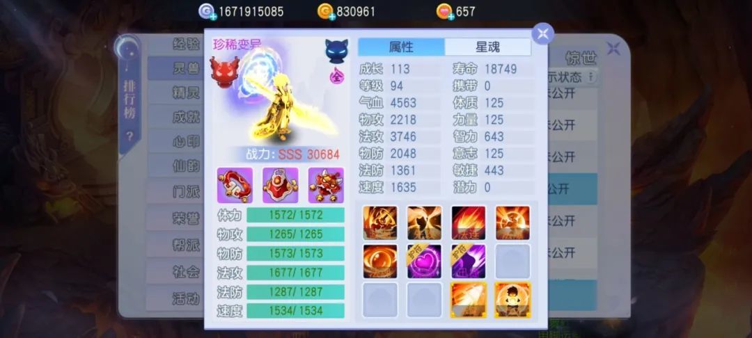 成长113,稍微低了一点!物防资质全满,法攻资质全满,速度资质全满,法防和气血不达标!整体资质只能说是一般!