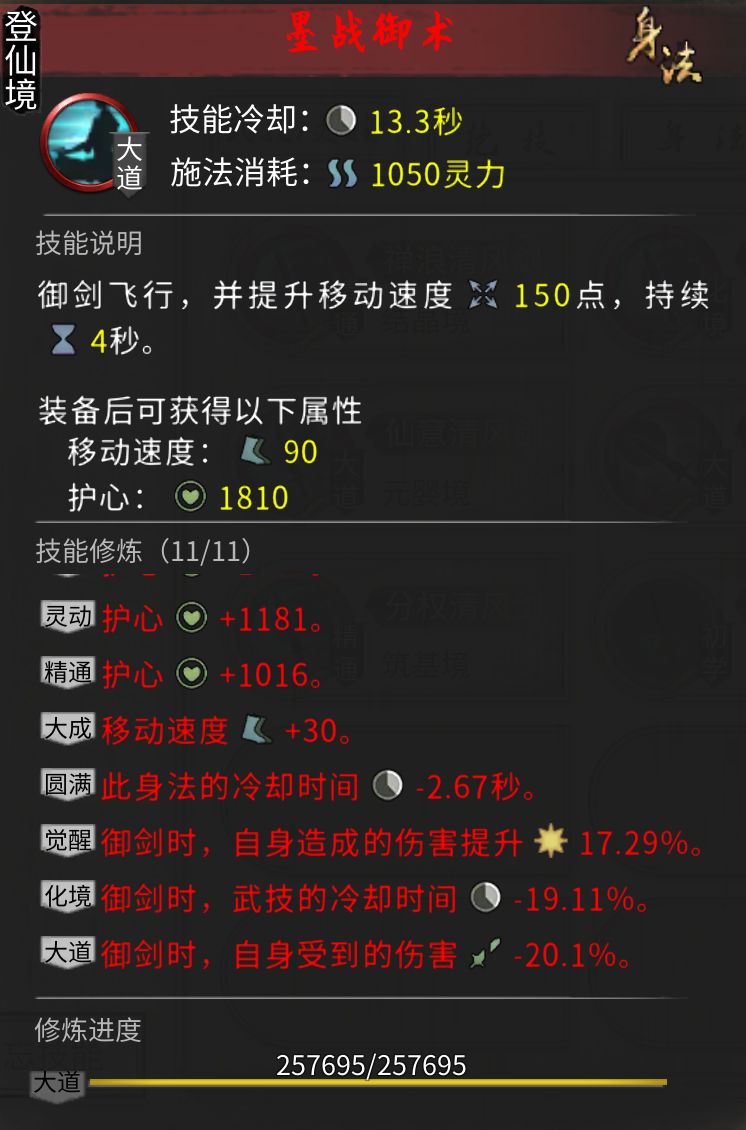 这个身法可以不用拿那么多移速增加而选择拿一些护心 本身御剑速度已经够用穿云电闪